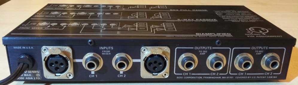 devices that big in the house I bought when I relocated. Back in 1990 I acquired my first Bose 802 speaker with 802c controller for a keyboard monitor, which worked extremely well for years. At the same time I purchased two speaker stands and mounting bracket so I could suspend the 802 at ear level. The fidelity is close to the JBL Control 5 monitors I use in my studio, so I had confidence that the keyboard patches I was developing in the studio would sound darn close on stage and in the PA. They are a compact and lightweight speaker to cart to gigs. Eventually I acquired more 802s as I realized they could function well as vocal monitors. I found four white ones in a store that I had to buy - Bose made them in white (not painted) for the worship market. Most veteran FOH folks have never seen the white ones. I had the idea to arrange them in a "checkered flag" setup for the glamour picture on the right (no I do not operate them stacked that high!). The 802s are loaded with eight 4-1/2in drivers with heavy duty 12oz magnets designed for high power handling, with cloth-impregnated surrounds on the cones. The cloth-impregnated surrounds were first introduced with the "Series II" speakers which are the only ones I buy. The previous 802 model did not have cloth-impregnated surrounds and they suffered from rotting with age, ruining the driver. The "Series II" and newer models last a long time. The enclosure is a strong polymer structure. The drivers are "full range" 50hz to 16Khz; while they don't produce low frequencies very well, they were adequate for monitors. 802s come with a lid with latches to protect the drivers during transit. About ten years after my first 802 speaker, I had assembled a pretty good sounding PA system consisting of a pair of JBL SF25 tops (later rebadged JRX-125 to resolve a trademark dispute) and four EV S-181 subwoofers. But it was too big for some venues. A smaller system of 802s would be better fit, but 802s alone do not make much of a PA system. So I did some research on the companion Bose 302 subwoofer. I heard a 802/302 system at a carnival and decided they would suffice, so I bought a pair of 302 "Series II" subwoofers that I found in a classified ad. The 802 and 302 comprised a decent sounding PA system for a small to medium size venue, but they won't project well enough for a long hall or outdoors (despite pictures of them used outdoors, forget it). They are part of the professional products line of Bose speakers and they handle the rigors of the road quite well. The 302 subwoofers are constructed from two glued layers of MDF high density impregnated resin board to stiffen the all the panels and reflect maximum sound pressure out the front (do they ever). I was surprised to find that each 302 subwoofer only contains two 12in speakers, but these things can pump bass. A lot of its success as a low frequency radiator is due to its cabinet and port design. It does the job for a compact box, but these are heavy (115lb). Many owners mount wheels on the bottom, but this defeats the bass response in that the cabinet is no longer coupled to the floor which allows low frequencies to radiate. The 802/302 system is modular - you can use anywhere from a single 802 to a stacked pair (the enclosures have integrated feet/slots for lining them up) to stereo single/stacked to subwoofer with single or dual 802s. The lid doubles as a monitor stand in that the feet rest on the edges of the lid to angle the 802 like a floor monitor. Show me anyone who scorns Bose 802s as "all highs no lows, must be Bose" and I'll show you someone who has used them without the 802c controller. I did try my 802 once without the controller and yes it sounded like sh!t. The controller is an essential element to the Bose 802/302 in that it processes the signal for optimal reproduction in the speaker. There is no way they sound good without it. An EQ is not a replacement for the controller. The controller also functions as a system control with whatever 802s and 302s are in your system - when you plug cables to the power amps driving the speakers, the controller automatically switches in a crossover and appropriate processing for a two way PA system with 802s and 302s. The controller has switches for low cut and high cut, for vocal monitor applications. With that in mind, I acquired enough controllers for the amplifier racks that I designed for the Bose PA system. I packed a QSC RMX1850 power amp and a Bose controller in the same rack, and designed an I/O panel with a cooling fan. I never needed the fan yet. Bose offered a rack mount kit for the controller, sometimes these can be found online. The RMX1850 rating of 600 watts into a 4ohm load was selected for optimal 240 watts continuous power match for each 802 speaker (a pair of 802s is a 4ohm load with 480 watt rating), and 600 watts continuous power for each 4ohm 302 subwoofer. These puppies can get loud. The controller processing results in a big midrange dip in the output so you need to make up the loss with a hefty amplifier. When I set up a Bose PA stack, I place the amplifier rack on top of the 302 subwoofer, then stack a pair of 802s on top of the amp rack - placing the 802s at ear level to the audience. If you're going to build a stack like this, the 802s should be braced to prevent them from being knocked over by any excited audience members. The rear of each 802 has threaded inserts for accepting braces; I simply bought some aluminum channel stock from a hardware store and made my own. The bolts should be M8x1.25 threading, length such that the bolt extends no longer than 10mm into the enclosure. I needed an EQ for my large PA, but no EQ is needed for this Bose system. Cabling is simple - I run FOH left/right from the mixer to the amplifier rack, then cables from the amp rack to the speakers. Simple and fast. While I gave up the large PA system, I did keep the 802/302 system. Another device I can use to drive my 802 as a keyboard monitor is 